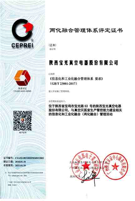 1月25日,寶光股份收到了由工信部電子第五研究所頒發(fā)的《兩化融合管理體系評定證書》,標志著寶光股份兩化融合管理體系正式通過了國家認證,寶光股份也成為國內(nèi)電真空行業(yè)首家取得國家兩化融合管理體系認證的企業(yè)。