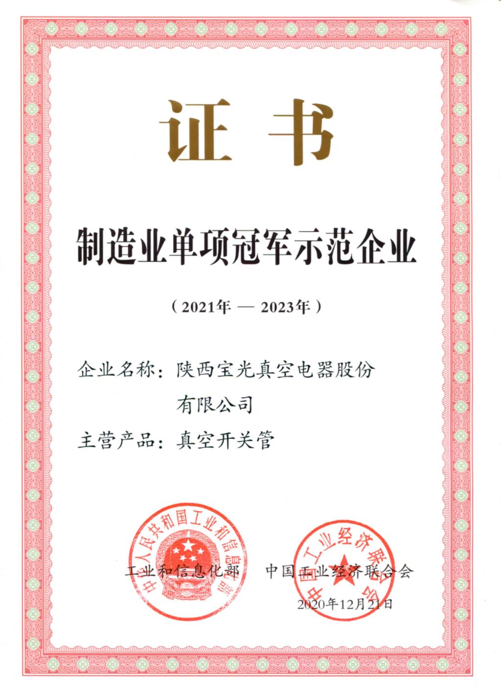 日前,陜西寶光真空電器股份有限公司(以下簡稱“寶光股份”)繼2017年入選制造業(yè)單項(xiàng)冠軍后,順利通過工業(yè)和信息化部與中國工業(yè)經(jīng)濟(jì)聯(lián)合會復(fù)核,蟬聯(lián)“制造業(yè)單項(xiàng)冠軍示范企業(yè)(2021-2023)”。