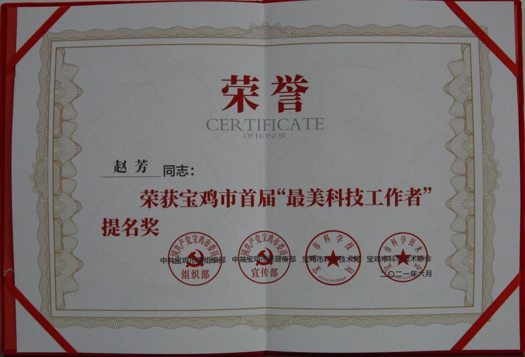近日,寶光股份趙芳在中共寶雞市委組織部、中共寶雞市委宣傳部、寶雞市科學技術局、寶雞市科學技術協(xié)會聯合開展的“尋找寶雞最美科技工作者”評比活動中,被授予2021年“優(yōu)秀科技工作者”提名獎。