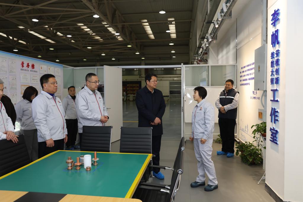 馬宏偉一行首先參觀了寶光集團所屬寶光股份滅弧室產(chǎn)品制造部3號產(chǎn)線、5號智能制造產(chǎn)線、李帆勞模技能大師工作室,詳細了解了企業(yè)發(fā)展歷程及技術(shù)創(chuàng)新、智能制造方面的情況,聽取了工作室在職工創(chuàng)新、技藝傳承、數(shù)字化制造技術(shù)應(yīng)用等方面取得的成果。