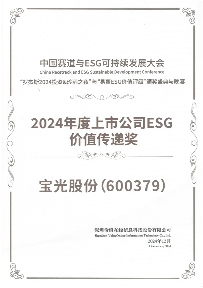 12月8日,易董價值在線ESG價值評級頒獎盛典在深圳舉行,寶光股份憑借在ESG方面的突出表現(xiàn),堅持透明、負責任的ESG實踐及有效的價值傳遞,榮獲“2024年度上市公司ESG價值傳遞獎”。該獎項的獲得是對寶光股份在ESG信息披露、投資者關(guān)系管理和市場溝通等方面的認可。