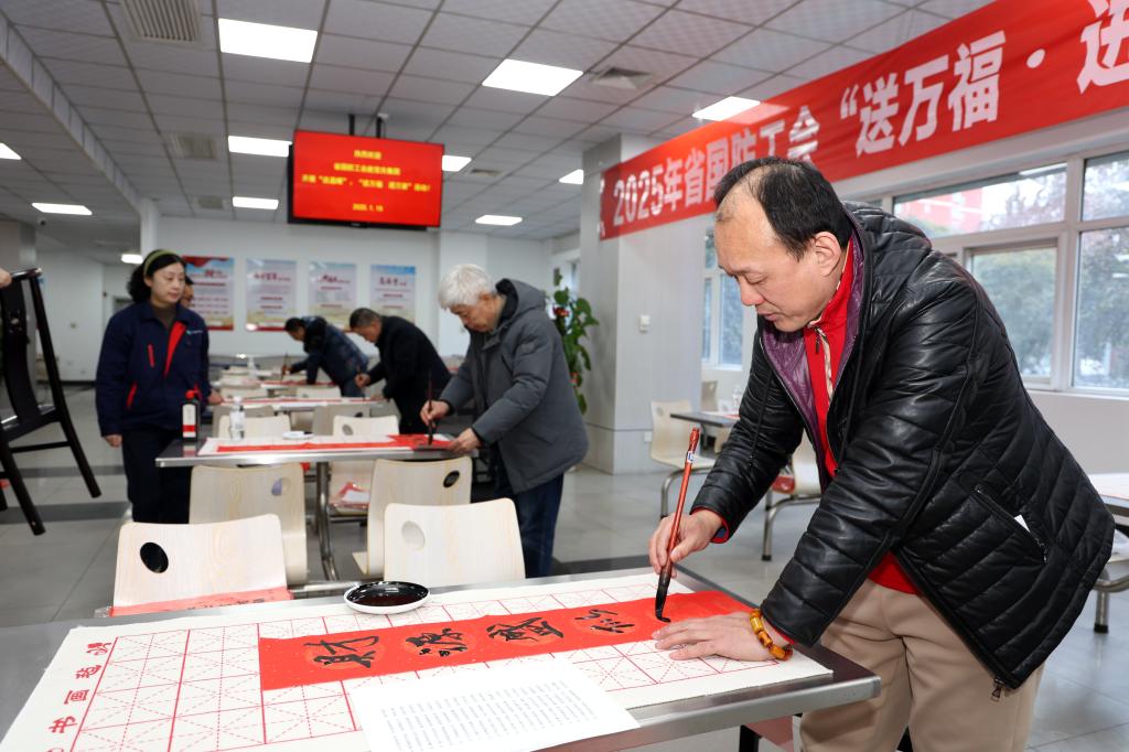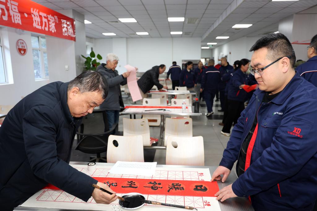 在送春聯(lián)現(xiàn)場(chǎng),書(shū)法家們揮毫潑墨、筆走龍蛇,聞?dòng)嵍鴣?lái)的職工紛紛圍在書(shū)桌旁期待成品。一停一頓、一起一落,一句句散發(fā)著清新墨香的吉祥語(yǔ)句躍然紙上,“一元二氣三陽(yáng)泰,四時(shí)五福六合春”“春滿(mǎn)乾坤千里秀,時(shí)逢盛世萬(wàn)家興”,一副副滿(mǎn)載美好祝福的春聯(lián)和“?!弊周S然紙上,既有辭舊迎新的熱切祈盼,也有對(duì)幸福生活的美好祝福。職工們拿到寫(xiě)滿(mǎn)祝福和美好祝愿的春聯(lián),喜悅之情溢于言表。活動(dòng)期間共送出春聯(lián)近400余幅,福字300余幅。