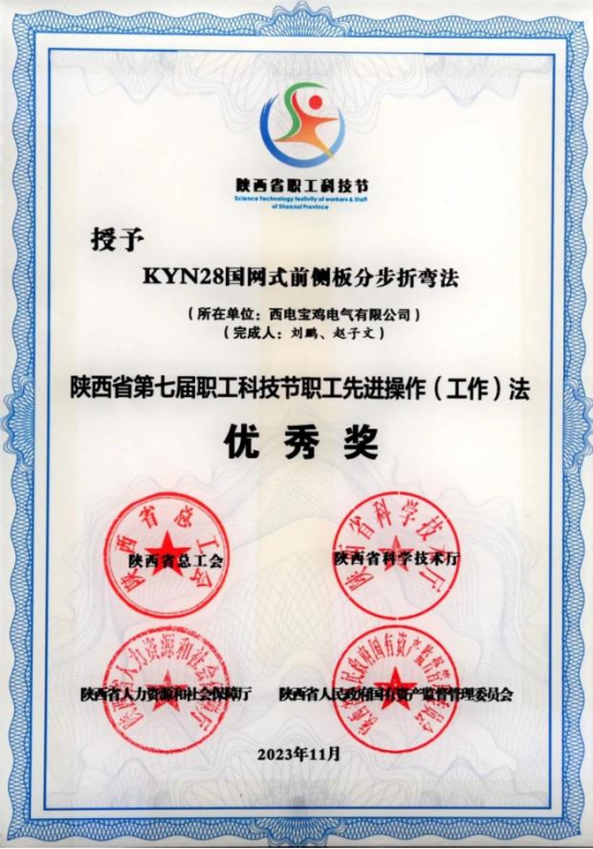 陜西省職工先進(jìn)操作(工作)法優(yōu)秀獎(jiǎng)——西電寶雞電氣“KYN28國(guó)網(wǎng)式前側(cè)板分步折彎法”