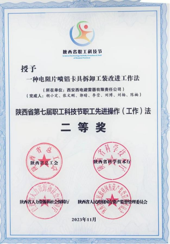 陜西省職工先進(jìn)操作(工作)法二等獎(jiǎng)——西電避雷器“一種電阻片噴鋁卡具拆遷工裝改進(jìn)工作法”