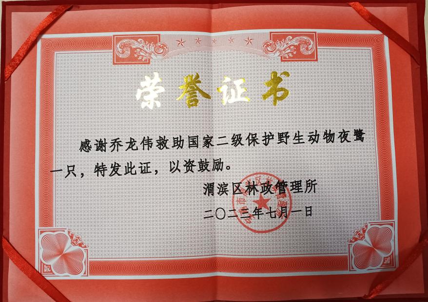 近期,寶光股份零件產品制造部喬龍偉同志成功救助一只夜鷺,獲渭濱區(qū)林政管理所表彰。