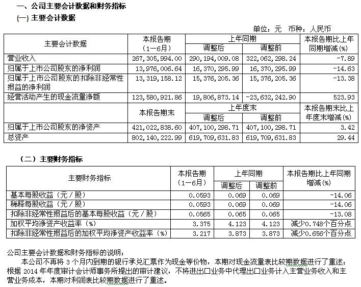 寶光股份2015年半年度主要財務(wù)指標(biāo)